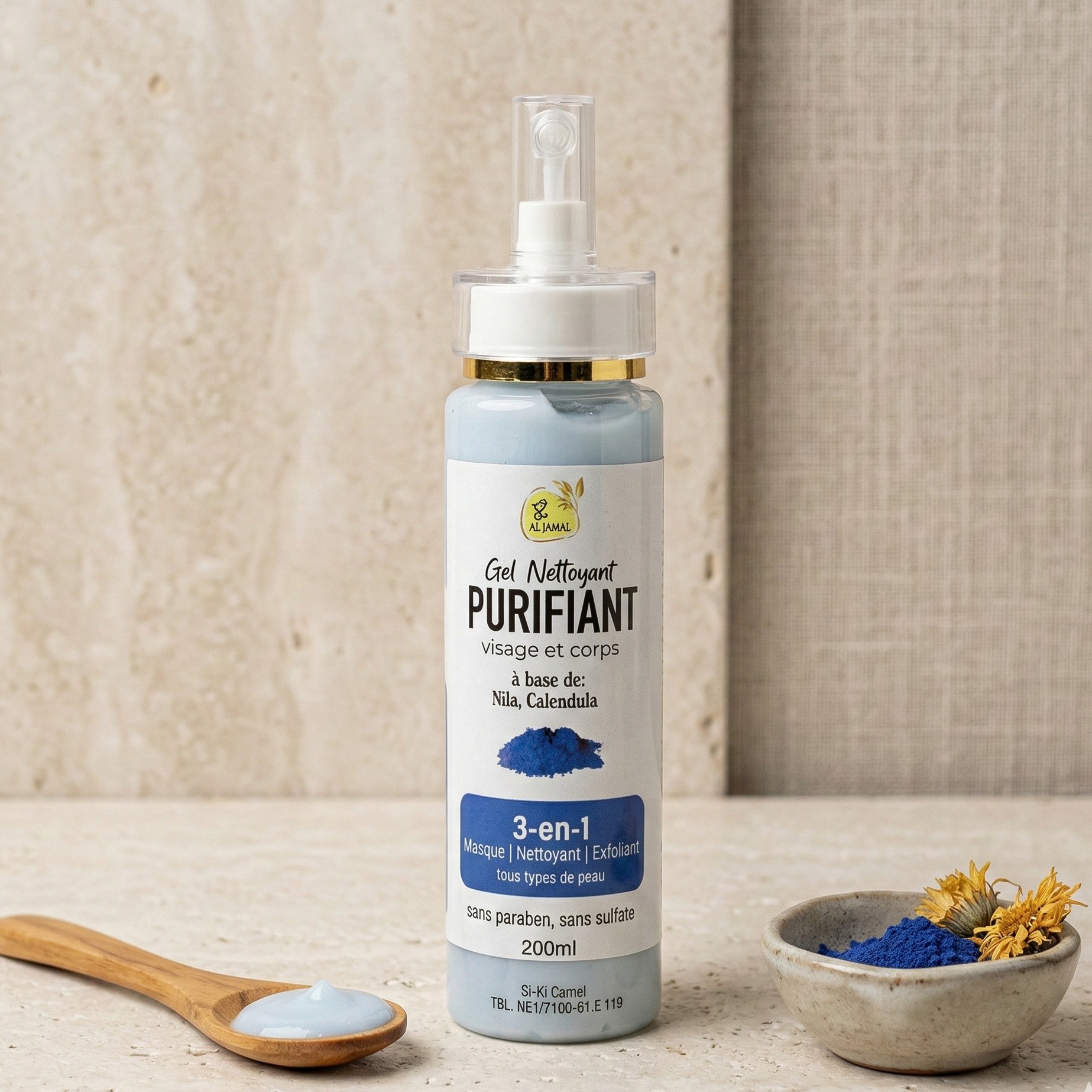 3-in-1 jujube and calendula gel — mask, cleanser, and exfoliator in one, paraben and sulfate-free.