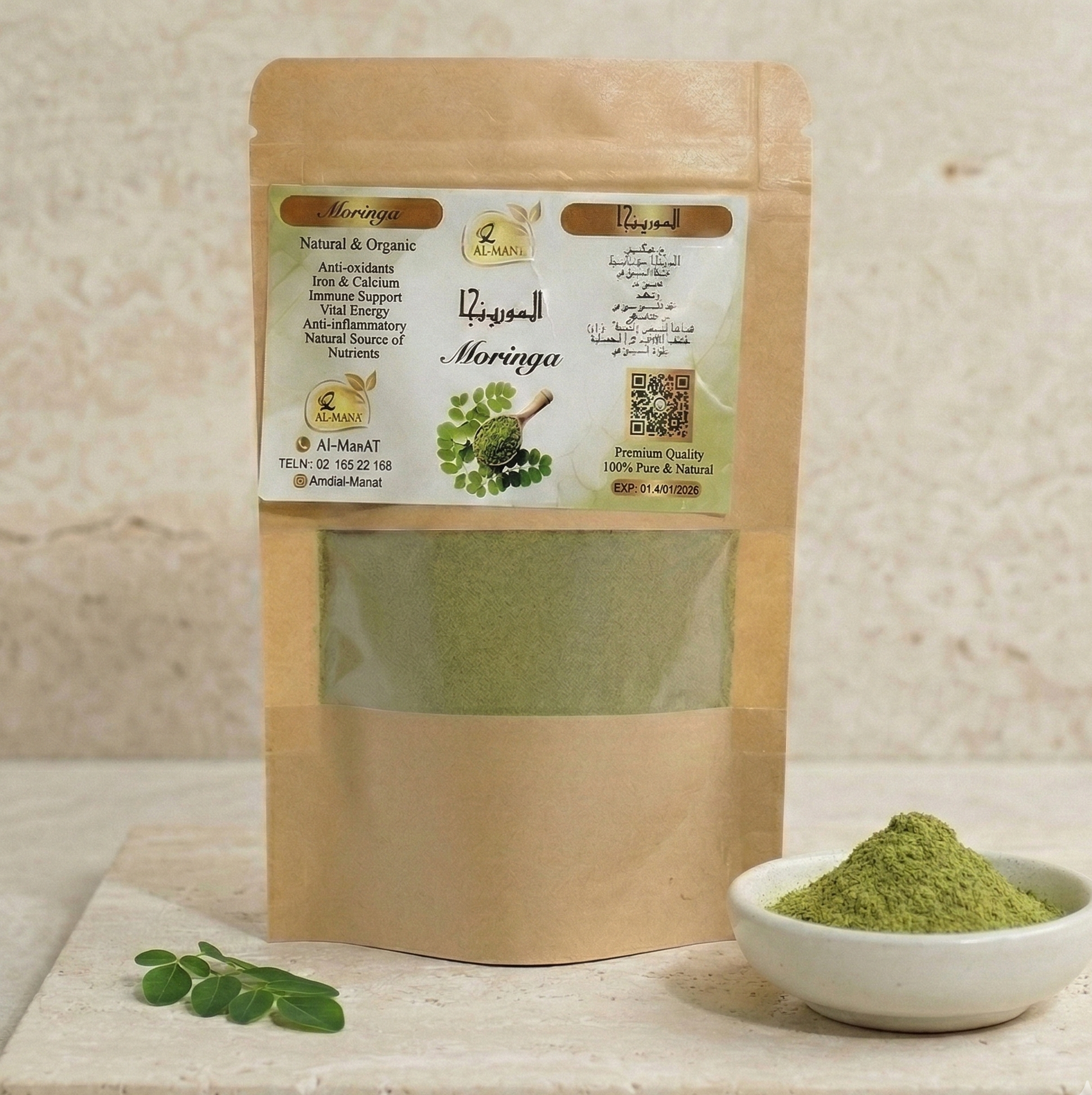 Superfood from dried moringa leaves, rich in vitamins, minerals, and antioxidants.