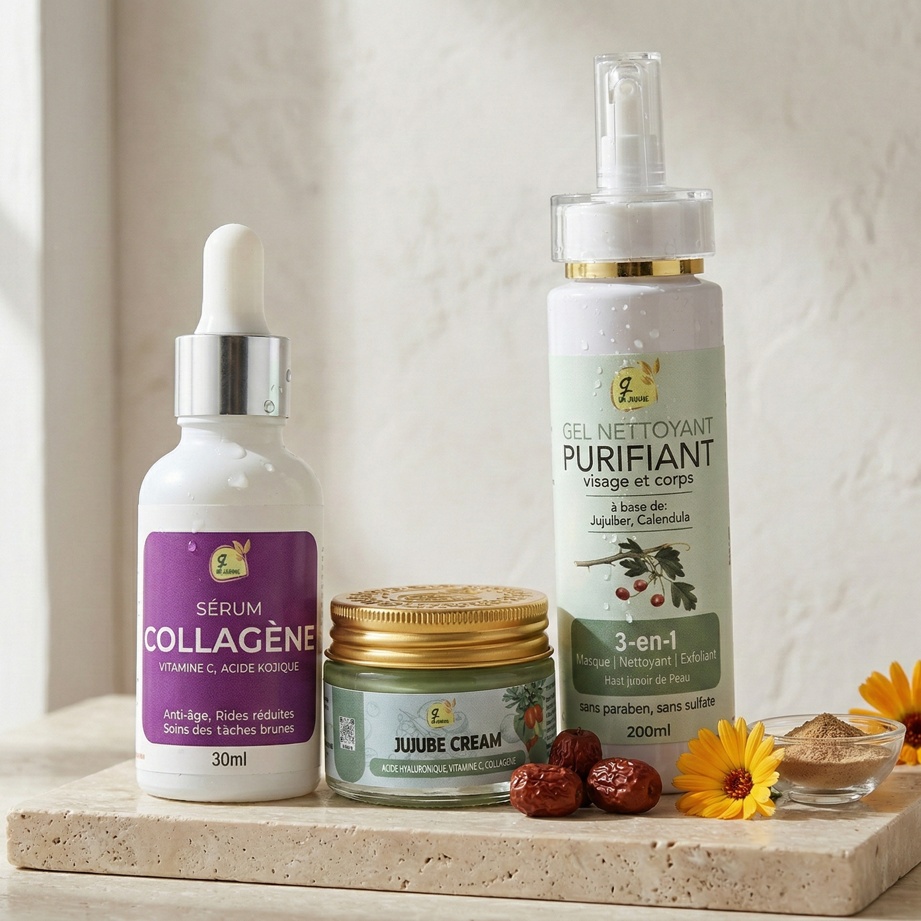Complete skincare set: purifying gel (200ml) + collagen serum (30ml) + Jujube cream (50ml).