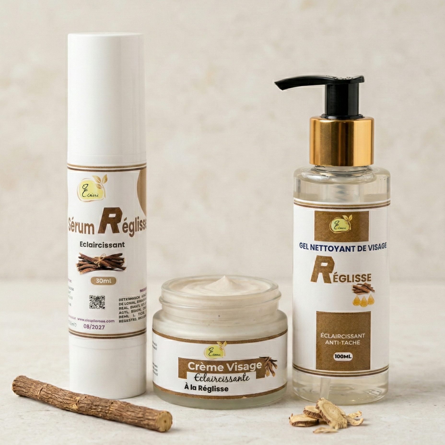 Licorice trio: cleansing gel + serum + cream to brighten, unify, and protect the skin.