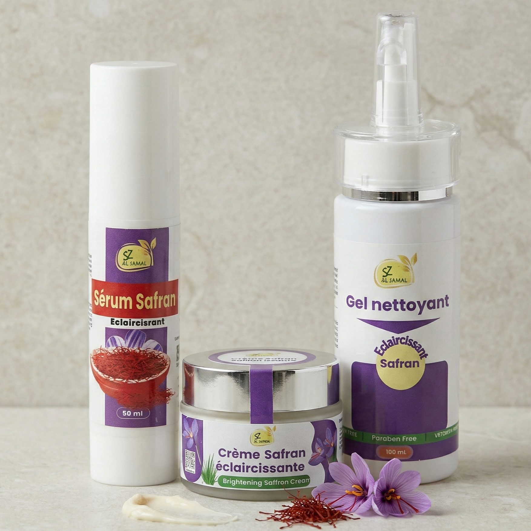 Saffron trio: saffron serum (50ml) + saffron cleansing gel (100ml) + brightening saffron cream.