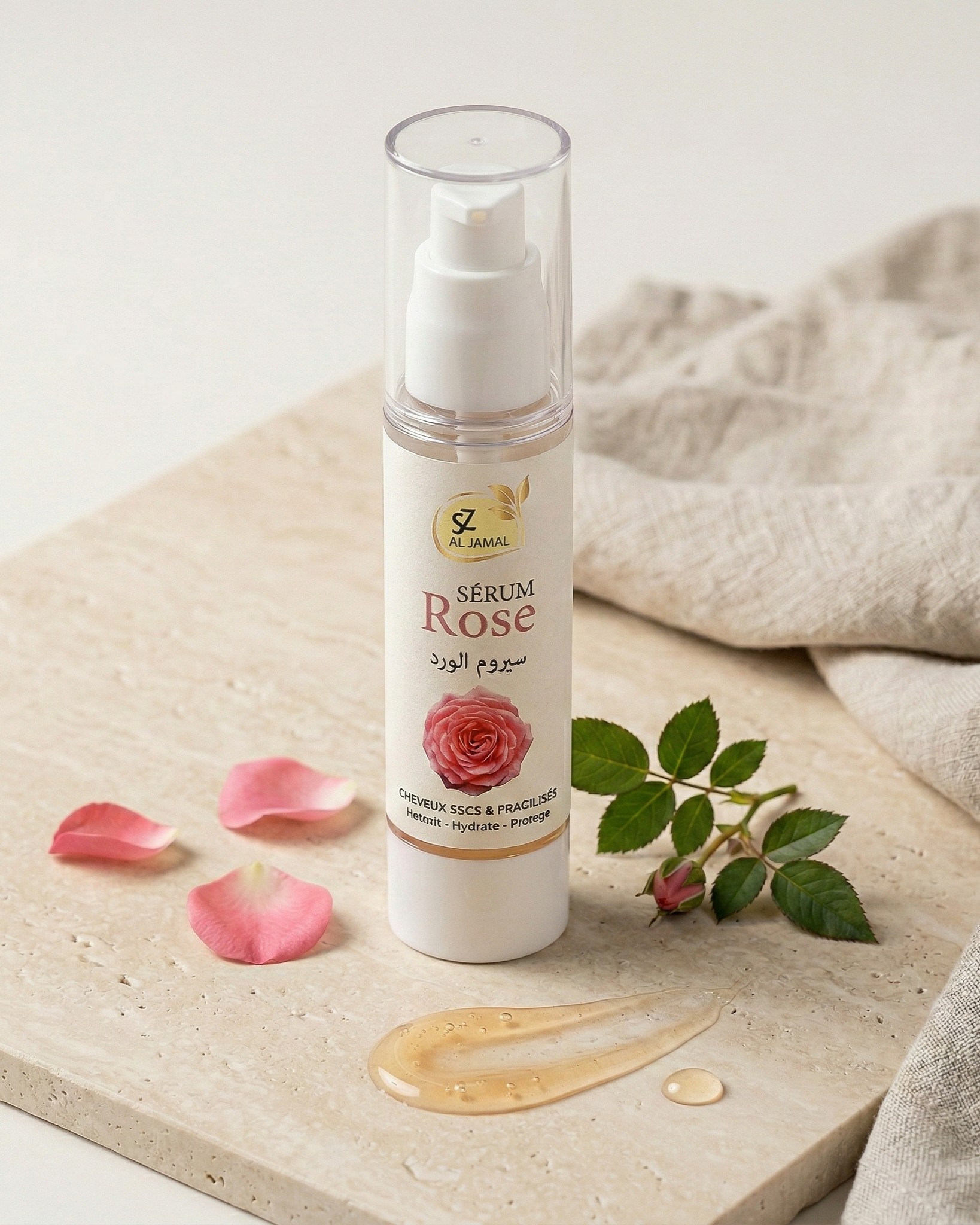 Rose hair serum that nourishes, hydrates and protects dry and fragile hair.